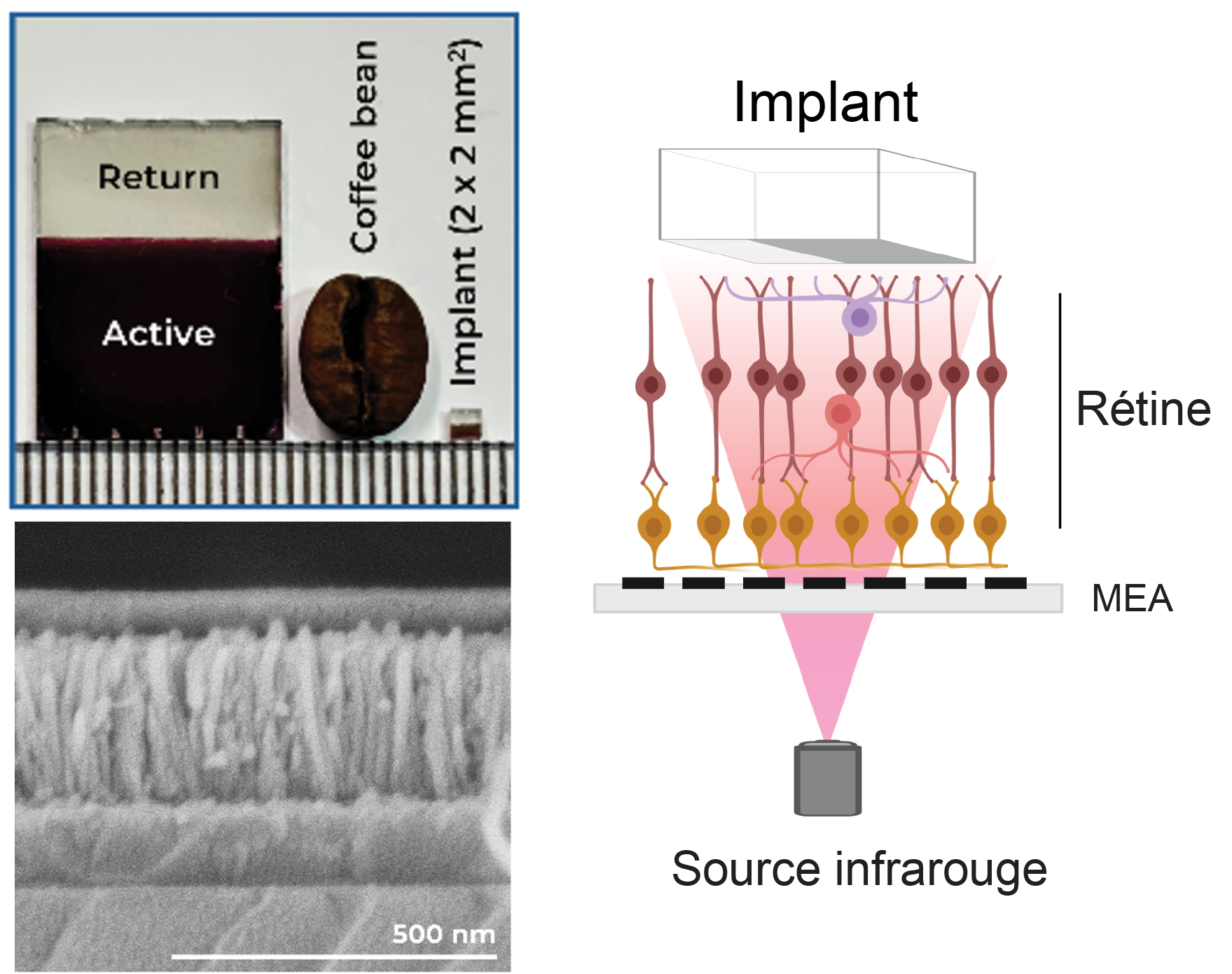 Top left: on the left, the photovoltaic device before the implant is cut; the implant is shown to the right of the coffee bean; bottom left: a cross-section of the implant, which consists of a layer of nanocrystalline material interpenetrated with semiconductor nanowires; right: an illustration of the functional characterisation device. The retina is positioned between the MEA and the implant. The entire setup is illuminated by infrared radiation.