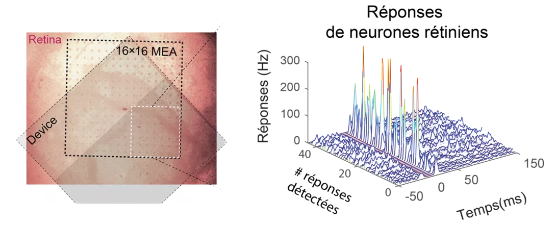 To test the proper functionality of the implant, the two researchers from the Institut de la Vision checked ex-vivo the activation of the ganglion cells of a blind rodent retina by measuring their electrical activity, this is called electrophysiology. To do this, they placed the retina on a MEA device or MultiElectrode Array device.