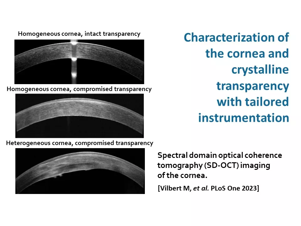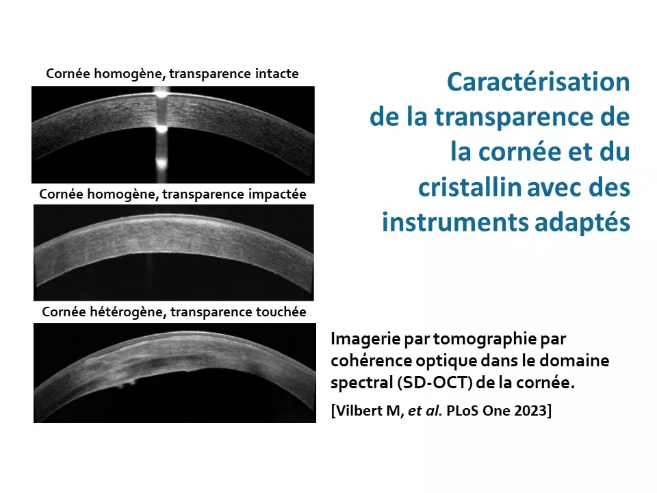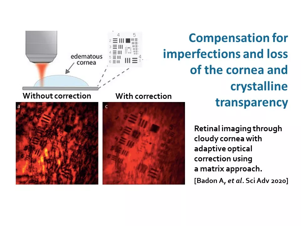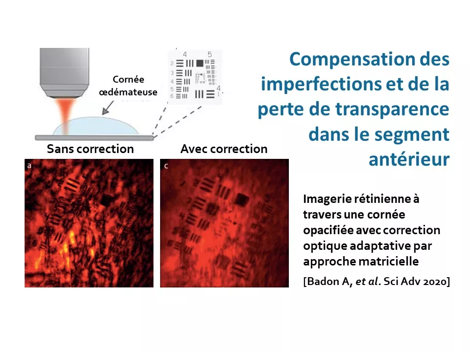 - Le premier axe vise à surmonter les limitations liées aux facteurs humains intrinsèques à l’imagerie des patients. Il comprend la caractérisation de la transparence du segment antérieur de l'œil (cornée et cristallin) à l’aide d’instruments adaptés (objectif 1), ainsi que la compensation des imperfections et de la perte de transparence dans le segment antérieur (objectif 2).